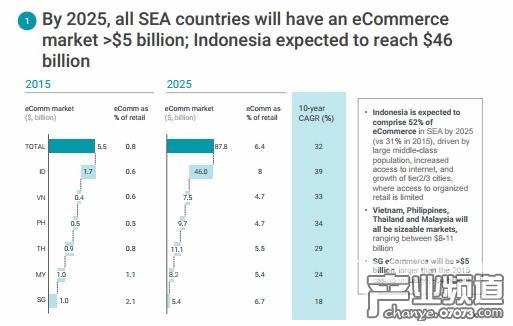 到2025年,東南亞地區(qū)所有國(guó)家的的電子商務(wù)市場(chǎng)總量都將超過50億美金,其中,印度尼西亞的市場(chǎng)總量將超過460億美金。