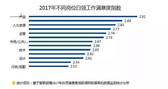 得益于“互聯(lián)網(wǎng)+”的浪潮和人工智能的火爆,產(chǎn)品和研發(fā)逐漸成為人氣崗位,在公司重要和受歡迎程度不亞于網(wǎng)絡(luò)上的人氣網(wǎng)紅。報告顯示,產(chǎn)品、研發(fā)崗位的白領(lǐng)工作滿意度較高,分別為2.92和2.84。