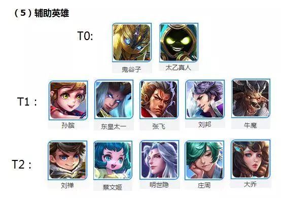 T1梯隊中,張飛和牛魔的坦度、探視野能力以及對后排的保護是所有輔助中最出色的;東皇太一的前期入侵能力非常出色,同時也是反制鬼谷子的有效手段之一;劉邦作為輔助也是非常不錯的選擇,有控制、大招開啟后增加的護盾和減傷能夠很好的保護后排,更重要的是劉邦在低資源情況下的能力算是輔助中的佼佼者。