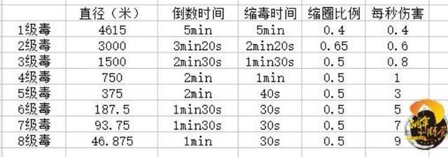 在10月21日更新公告出來(lái)后,一個(gè)香港的視頻作者測(cè)試了新版的毒圈傷害,他說(shuō)一級(jí)毒與原來(lái)傷害相同,數(shù)值為0.4點(diǎn)/秒,二、三、四級(jí)毒傷害為原來(lái)的下一級(jí),也就是0.8、1.0、3.0點(diǎn)/秒,以此推理毒圈傷害增加,從二級(jí)毒以后傷害分別為原來(lái)下一級(jí)的毒圈傷害。