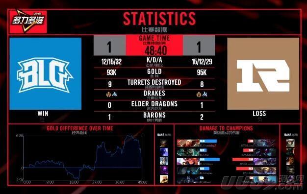比賽開始,RNG強勢壓制BLG下路組合,走A擊殺滑板鞋拿下一血。前期RNG稍占優(yōu)勢但隨著佐伊發(fā)育成型,BLG迎頭趕上。第一條大龍,螳螂虎口搶食,在獅子狗和滑板鞋手中搶龍成功,再次將局面扳回五五開。吸血鬼裝備成型來到強勢期,BLG抱團強拆RNG下路高地,姿態(tài)繞后傳送,布隆大招強迫吸血鬼血池,大蟲子一口吃掉吸血鬼,佐伊被卡薩丁追殺,BLG潰敗,RNG拔掉中路二塔還輕松收下第二條大龍,成功掌握比賽局勢。帶著第二條大龍BUFF,RNG中下分推,卡薩丁中路失誤被殺讓BLG反推中路高地。兩相僵持,雙方各有失誤,BLG擊殺第二條大龍后團戰(zhàn)吸血鬼被擊殺,RNG直破BLG中路高地,順手拿下遠古巨龍。在十分鐘的拉扯期后,RNG中路團戰(zhàn)的失敗給了BLG一波的機會,比分來到1:1。
