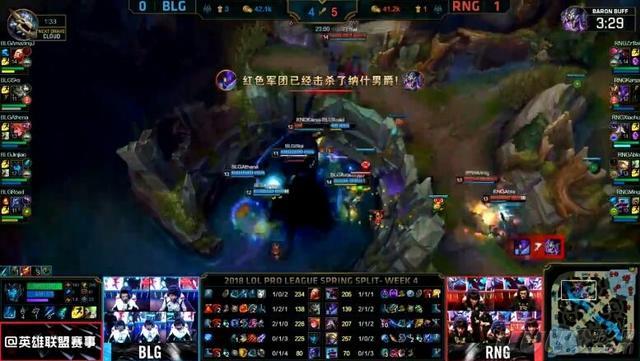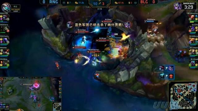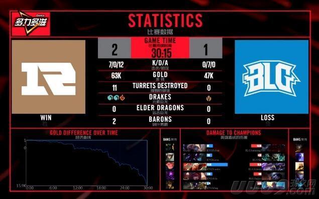 雙方都是后期陣容,獅子狗和螳螂的前期Gank能力不高,六級之后,波比游走中路,吸血鬼被逼走向下路河道,反被卡薩丁和螳螂聯(lián)手拿下一血。RNG各線選手基本功扎實,都實現(xiàn)壓刀,BLG先手動峽谷先鋒反被RNG包抄,獅子狗被擊殺后,RNG順勢拿下中路一塔。沒有中一塔的卡薩丁非常難受。RNG再帶著峽谷先鋒直破BLG下二塔,BLG守塔能力不強的弱點暴露出來,20分鐘BLG破了三座外塔。RNG利用視野優(yōu)勢偷大龍,波比錘飛奧恩,BLG喪失搶龍能力,攜帶大龍Buff,RNG拔光BLG所有外塔,經(jīng)濟差距越來越大。利用第二條大龍Buff,RNG成功拿下比賽,恭喜RNG四連敗后首勝!