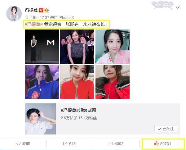 2025年1月19日下午,馮提莫發(fā)微博說了一句話:“我覺得第一張腿有一米八那么長!”,嗯,然后就有5W多網友給她點了贊,看來馮提莫小姐姐的魅力真的是很大啊!