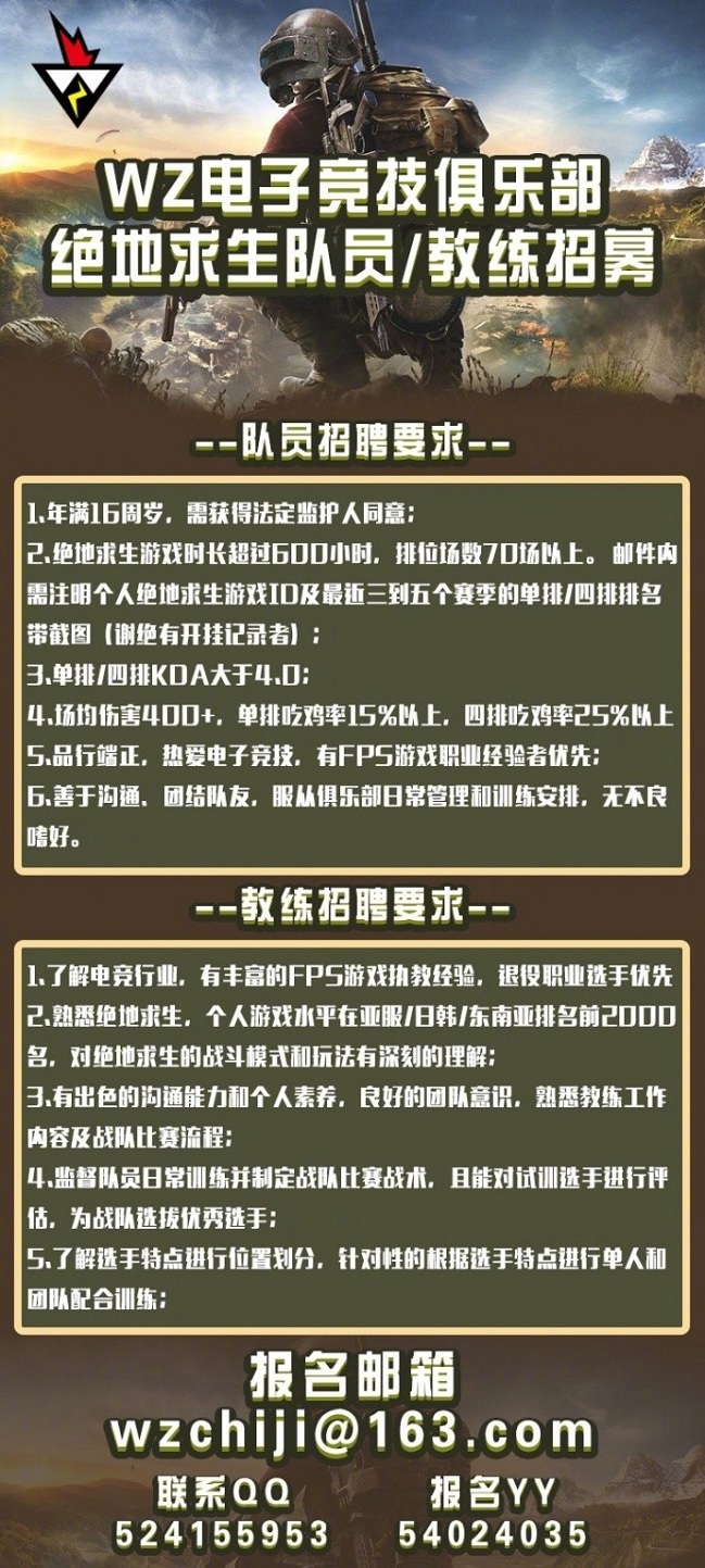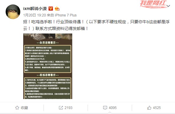 雖然絕地求生國服還未開啟,但這絲毫不影響游戲在國內(nèi)的熱度,吃雞戰(zhàn)隊(duì)如雨后春筍般在國內(nèi)紛紛成立。近日全民直播的三大佬:小智、小漠和帝師就在微博宣布成立絕地求生戰(zhàn)隊(duì),要求也是很符合三位大佬一貫的行事風(fēng)格,除了水平要過得去外,只要有過開掛記錄,那就一律不得錄用,可以說是緊貼當(dāng)下熱點(diǎn)了。