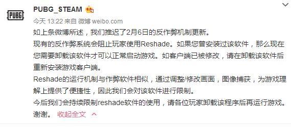 今日藍(lán)洞官微再發(fā)一條微博介紹了新的反作弊機(jī)制,大致意思就是即將更新的反作弊系統(tǒng)會(huì)BAN掉著名的輔助軟件Reshade,如果玩家安裝過該軟件,將無法啟動(dòng)游戲,需要卸載該軟件后才能正常游戲。如果該軟件修改了游戲,玩家還需要重新安裝《絕地求生》客戶端。