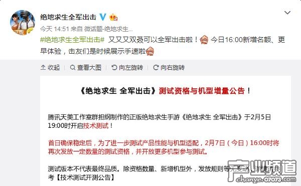 騰訊出品的正版吃雞手游《絕地求生全軍出擊》于2月5日開(kāi)啟技術(shù)測(cè)試,今天,《絕地求生全軍出擊》官方宣布將增加測(cè)試資格,同時(shí)開(kāi)放更多機(jī)型。