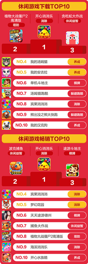 1月份的休閑游戲榜單,還是保持著一如既往的穩(wěn)定,上榜的產(chǎn)品都是熟悉的面孔。休閑游戲榜單的穩(wěn)定,源自于游戲本身的特性和玩家群體的穩(wěn)定性。假日效應(yīng)對(duì)休閑游戲的影響也并不會(huì)特別的顯著,這一點(diǎn)我們可以從國(guó)慶長(zhǎng)假后榜單的穩(wěn)定性推算出來。由于中小學(xué)生放假的原因,《我的湯姆貓》、《我的安吉拉》等游戲可能會(huì)出現(xiàn)一定的漲幅,但對(duì)于整體榜單的影響并不大。