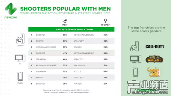 雙方熱衷的游戲也有所不同。在主機(jī)、PC、手機(jī)三個(gè)類(lèi)別中,射擊游戲都是男性的最?lèi)?ài),他們?cè)谑钟沃衅貌呗灶?lèi)的原因,大概是設(shè)備無(wú)法發(fā)揮射擊游戲的魅力;女性則更喜歡動(dòng)作冒險(xiǎn)類(lèi)游戲,策略游戲排名第二,她們?cè)谑謾C(jī)上更愛(ài)解謎游戲,以及吃豆人這樣的經(jīng)典街機(jī)游戲??傮w看來(lái),男性在射擊動(dòng)作領(lǐng)域?qū)>缘膼?ài)好則更為廣泛。