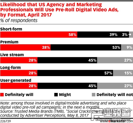 根據(jù)Trusted Media Brands對(duì)美國曾經(jīng)投放過數(shù)字廣告或移動(dòng)廣告的市場營銷與代理公司進(jìn)行的調(diào)查,在所有受訪者中,58%的受訪者表示他們在未來六個(gè)月內(nèi)“肯定會(huì)投放”簡單的前置式視頻貼片廣告。超過四分之一(28%)的受訪者表示他們在未來六個(gè)月內(nèi)“肯定會(huì)投放”流媒體廣告,不過有同樣多的受訪者(27%)表示他們“肯定不會(huì)投放”。