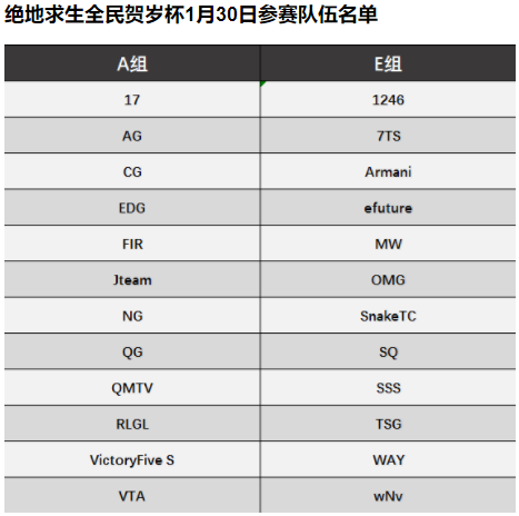 昨天21點“全民吃雞賀歲杯”第八比賽日AE組最后一局比賽正式開始,兩組參賽隊伍如下: