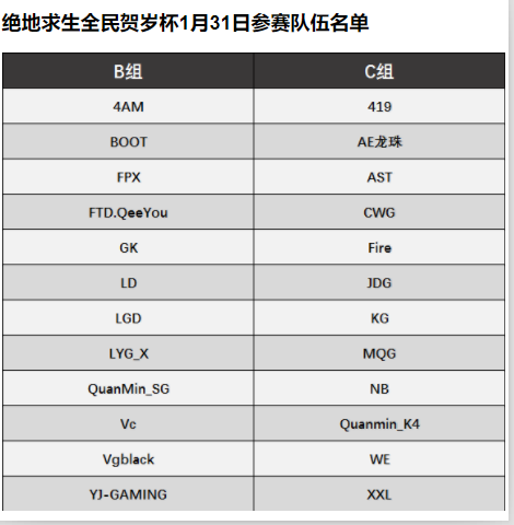 昨天19點全民吃雞賀歲杯第九比賽日BC組比賽開始,參加比賽的組伍如下: