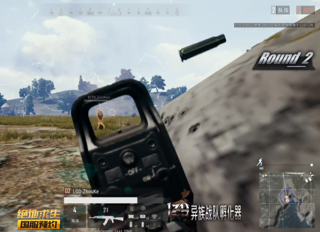安全區(qū)刷新后,安全區(qū)刷在了FPX和LGD所處的位置,隨后FPX利用高處的視野優(yōu)勢將遠處的兩名“獨狼”隊員擊殺,形成2V2對決。