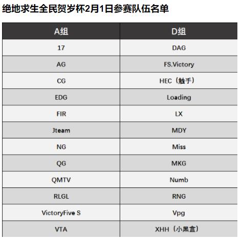 全民吃雞賀歲杯第十日AD組于昨晚19點開賽,雙方隊伍如下: