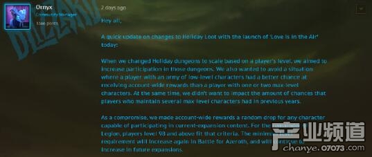 簡(jiǎn)單翻譯下,就是把節(jié)日地下城改為動(dòng)態(tài)等級(jí),只是為了不讓瘋狂開(kāi)小號(hào)來(lái)刷火箭的玩家通過(guò)這種方式獲得火箭,作為平衡,將火箭改為能夠參與當(dāng)前資料片內(nèi)容的角色隨機(jī)掉落,即98以上角色。并且提到也將在未來(lái)的資料片中提高這個(gè)等級(jí),即等級(jí)下限。