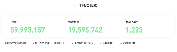 系統(tǒng)自動向 TFBOYS 團體預(yù)留總共 60% 的飯票,即每名藝人將分別獲得 20%。剩下的 40% 將由全球粉絲共享,采取免費認領(lǐng)和認購相結(jié)合的模式,每天免費發(fā)放 10 萬張,認購比例為 1 以太幣(ETH)兌換 3000 張 TFBC。