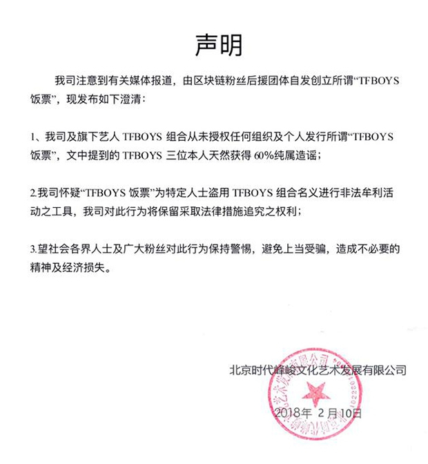雖然是打著 TFBoys 旗號,這顯然是粉絲自發(fā)的行為,因為藝人所屬的時代峰峻很快發(fā)表了聲明澄清與該站的關(guān)系,表示從未授權(quán)任何組織及個人發(fā)行相關(guān)飯票,否認 TFBoys 三人獲得 60% “TFBOYS 飯票”的消息,并懷疑是特定人士借用區(qū)塊鏈概念盜用組合名義進行非法牟利活動,會采取法律措施進行追究。