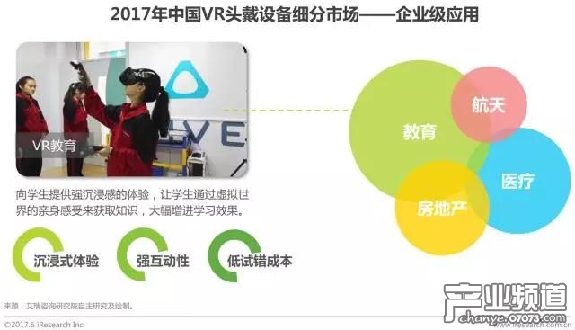 在VR的企業(yè)級(jí)應(yīng)用當(dāng)中,企業(yè)級(jí)解決方案(包括設(shè)備、軟件開發(fā)、其他適配)的銷售是現(xiàn)階段主要的收入來源。VR技術(shù)可以應(yīng)用于教育、醫(yī)療、房地產(chǎn)、航天等諸多領(lǐng)域,目前來看,頭戴設(shè)備銷售的重點(diǎn)領(lǐng)域集中在教育和培訓(xùn)需求上面。政府對教育信息化強(qiáng)有力的支持,以及教育體系自身的創(chuàng)新需要,共同驅(qū)動(dòng)著VR教育垂直市場的發(fā)展。