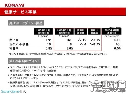 健康服務(wù)事業(yè)部:銷(xiāo)售額為161億日元(同比減少6.7%),部門(mén)利潤(rùn)為6億日元(同比減少42.5%)。KONAMI公司于該季度在大阪市西九條開(kāi)設(shè)了一家主打健康飲食、美容和減肥的俱樂(lè)部。