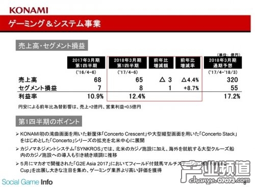 游戲音樂(lè)及系統(tǒng)事業(yè)部:銷(xiāo)售額為65億日元(同比減少4.4%),部門(mén)利潤(rùn)為8億日元(同比增長(zhǎng)8.7%)。KONAMI公司于該季度面向北美投入了公司首款采用曲面屏幕的音樂(lè)主機(jī)“Concerto Crescent”。