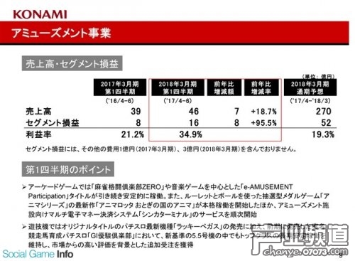 娛樂(lè)機(jī)器事業(yè)部:銷(xiāo)售額為46億日元(同比增長(zhǎng)18.7%),部門(mén)利潤(rùn)為16億日元(同比增長(zhǎng)95.5%)。該部門(mén)的主要收益仍舊來(lái)自街機(jī)游戲《麻雀格斗俱樂(lè)部ZERO》和音樂(lè)街機(jī)游戲《e-AMUSEMENT Participation》。