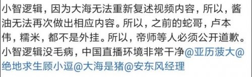 現(xiàn)在很多人錘外掛,是因?yàn)閷?duì)外掛的恨,錘了對(duì)游戲環(huán)境有好處,至于能否獲得一定的利益是各自掄錘子人的本事,結(jié)果小智處處拿這種無(wú)關(guān)的東西來(lái)攪渾水,給對(duì)方在言語(yǔ)上下套,讓大海表明自己是“為了正義”才錘的掛,不應(yīng)該收取觀眾打賞的禮物,逼著對(duì)方把禮物全部捐出來(lái)。