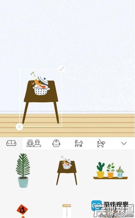 其次,這款產(chǎn)品操作簡單,使用成本低。用戶直接點(diǎn)擊喜歡的貼畫,該貼畫就會自動出現(xiàn)在空房間。選取若干張貼畫之后,用戶可以自由地對這些元素進(jìn)行排列布陣(自由移動、拖拽、放大縮小等),直到形成一幅自己滿意的“全家福”為止。