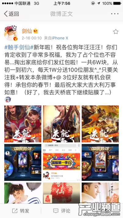 從去年2月至今,剛好一年時間,劍仙從30萬訂閱,增長為現(xiàn)在430萬觸手直播的站內(nèi)訂閱,成為名符其實的“王者榮耀一哥”,離不開百萬粉絲長期以來的支持和關注。心懷感恩,在這個中國最傳統(tǒng)的節(jié)日里,劍仙用自己的方式,表示對粉絲們的感謝,6萬塊錢壓歲錢,祝所有小西瓜們新年快樂,在劍仙和他的直播間里,大家可以一直歡樂下去,我們不長大,永遠是瓜三歲。