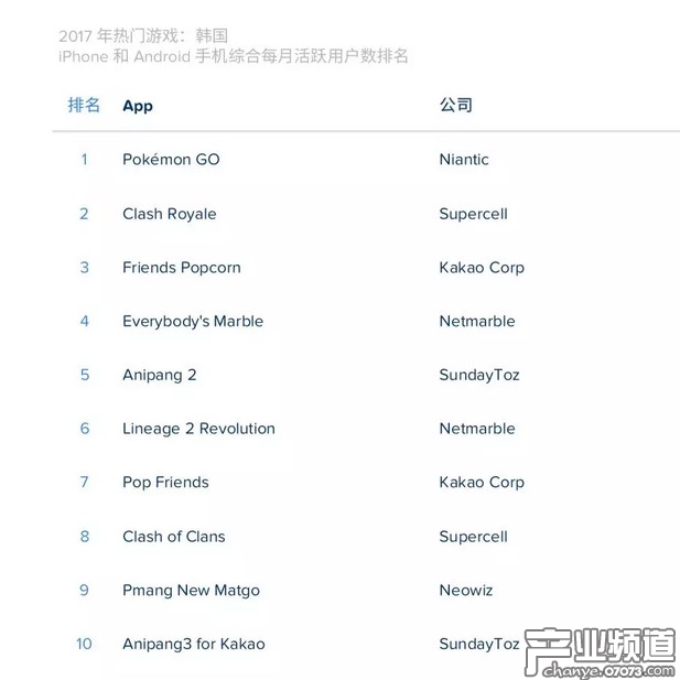 2025年度韓國手游每月活躍用戶數(shù)排名:《Pokemon Go》、《皇室戰(zhàn)爭》、《Friends Popcorn》、《天天富翁》、《Anipang 2》、《天堂2:革命》、《Pop Friends》、《部落沖突》、《Pmang New Matgo》和《Anipang 3 for Kakao》。