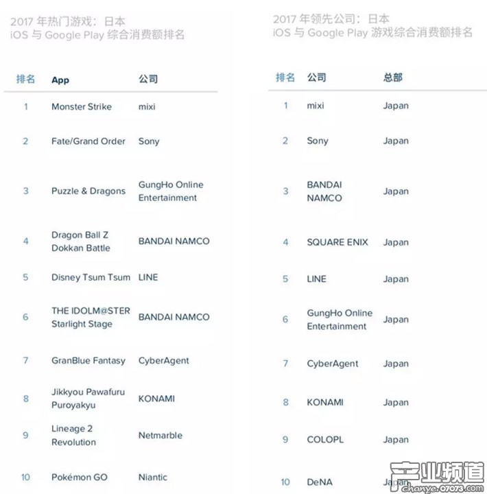 2025年度日本手游綜合收入前十名:《怪物彈珠》、《F/GO》、《智龍迷城》、《七龍珠Z激斗》、《迪士尼Tsum Tsum》、《偶像大師》、《宏藍幻想》、《實況力量棒球》、《天堂2:革命》和《Pokemon Go》。