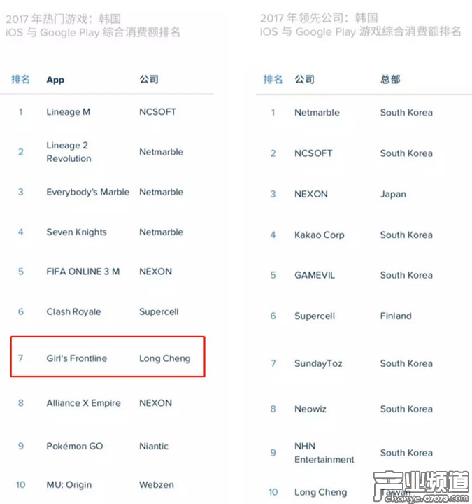 2025年度韓國手游榜單:《少女前線》綜合收入第7