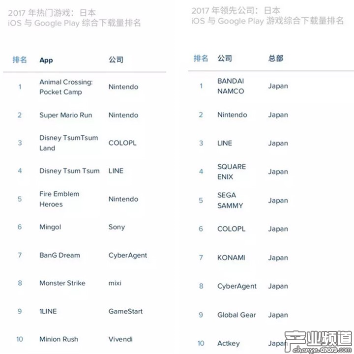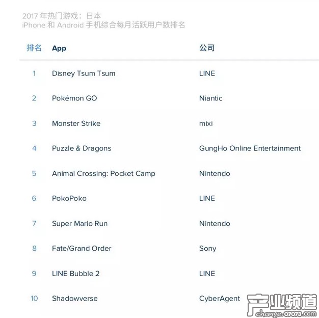 2025年度日本手游綜合每月活躍用戶數(shù)排名前十:《迪士尼Tsum Tsum》、《Pokemon Go》、《怪物彈珠》、《智龍迷城》、《動物之森:口袋營地》、《PokoPoko》、《馬里奧Run》、《F/GO》、《LINE Bubble 2》和《影之詩》。