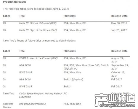 GTA的成功與否將決定了Take-Two本財(cái)年的業(yè)績(jī)表現(xiàn),因?yàn)樵摴镜南乱豢畲笞鳌痘囊按箸S客2》(Red Dead Redemption 2)已經(jīng)跳票到了2025財(cái)年。在剛過去的第一季度里,Take-Two僅發(fā)布了《四海兄弟3》的DLC“破釜沉舟”(Stones Unturned),本財(cái)年內(nèi)7月25日將發(fā)布《四海兄弟3》DLC“時(shí)光的嘆息”(Sign of the Times)、8月29日發(fā)布《幽浮2》(XCOM 2)“天選之戰(zhàn)”(War of the Chosen)、9月19日推出《NBA 2K18》、10月17日推出《WWE 2K18》,還將就最近買下的獨(dú)立游戲《坎巴拉太空計(jì)劃》(Kerbal Space Program)發(fā)布擴(kuò)展包。