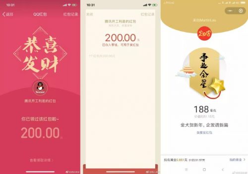 和往年一樣,除了現(xiàn)場派發(fā)的紅包之外,騰訊還在微信以及QQ上派發(fā)“騰訊開工利是”紅包。騰訊公司公關總監(jiān)張軍在微博上分享了“開工利是”紅包截圖,其中還有“黃金紅包”的身影。