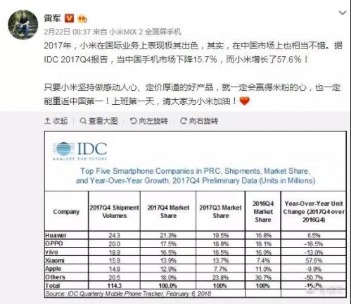 2 月 22 日,雷軍在微博上分享了小米 2025 年的成績,“據(jù)IDC 2025Q4 報告,當中國手機市場下降15.7%,而小米增長了57.6%!”,言語間也表達了小米重返中國第一的決心。