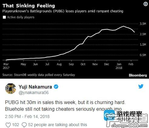 截至本周,《絕地求生》的總銷量達(dá)到了3000萬之巨,但是游戲的日均活躍玩家數(shù)卻在逐漸下降了。彭博社科技記者Yuji Nakamura表示,《絕地求生》PC版日活躍玩家數(shù)下降跟作弊猖狂可能有很大關(guān)系。