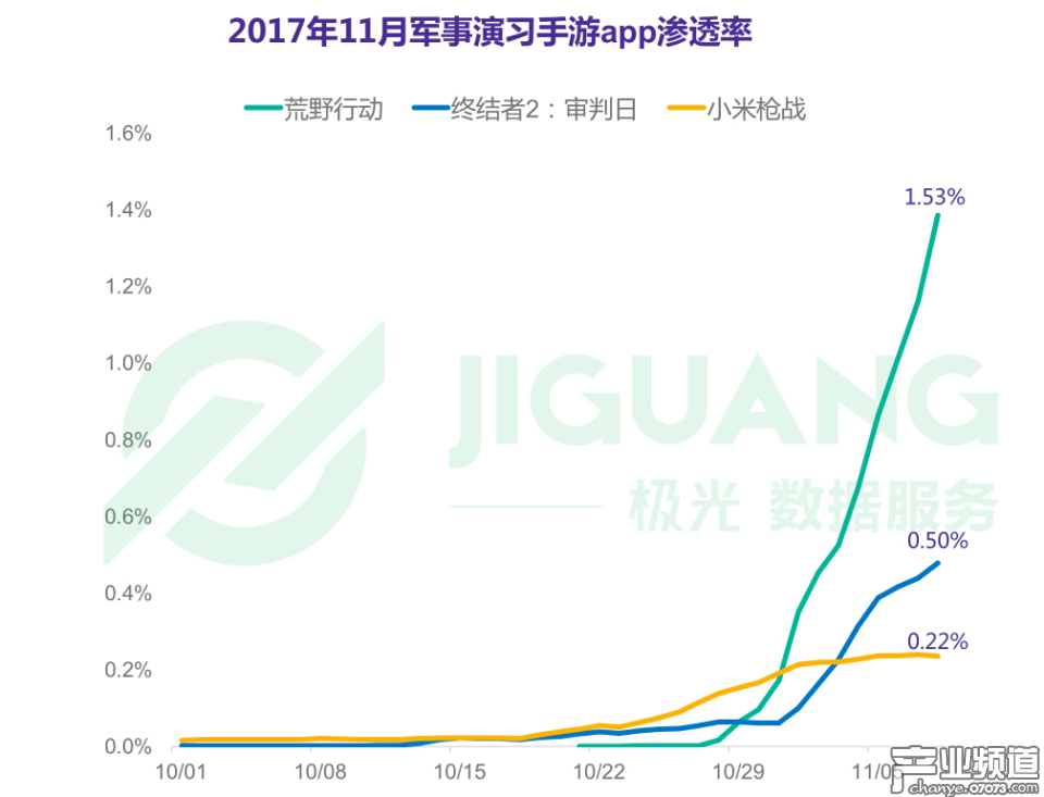 而現(xiàn)象級(jí)的吃雞手游用戶(hù)也在2025年呈現(xiàn)爆發(fā)式增長(zhǎng),從10月開(kāi)始,以《荒野行動(dòng)》《終結(jié)者2:審判日》《小米槍?xiě)?zhàn)》為代表的吃雞手游APP日均新增用戶(hù)數(shù)不斷上升,各自滲透率也迅速走高,在11月初分別達(dá)到1.53%、0.5%和0.22%。