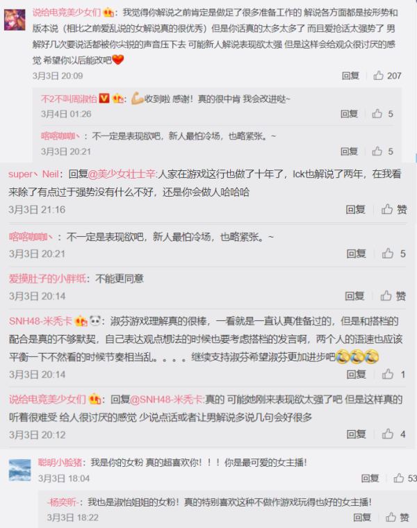 當(dāng)然,淑怡的不足之處大家也都看在眼里。性格強(qiáng)勢的她總會因急于表現(xiàn)自己而搶過搭檔的話頭,并且在選手打出精彩操作時(shí)聲音會過于激動而變得尖銳??磮D中她對粉絲的回復(fù)顯然也虛心接受了粉絲的意見,并自我反省。畢竟有反省,才能有進(jìn)步嘛。