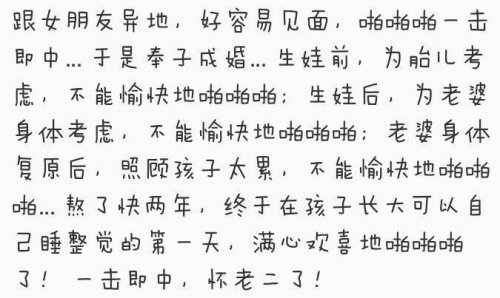 大扛新交了一個(gè)女朋友,國外來學(xué)習(xí)的留學(xué)生,美國人。然后,對吧,大扛四六級(jí)都沒有過,口頭語還停留在“愛慕李累我死有內(nèi)幕暗的有”這個(gè)水平上。于是問我怎么和人家姑娘溝通。我就說,愛情講究的不是表面的文字,講究的是心中的那一份真摯。無論對方說什么,你只要說“I LOVE YOU TOO”就可以了。大扛一聽,臥槽,簡直豁然開朗。
