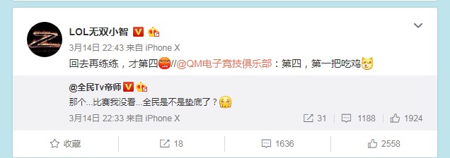 全民賀歲杯線下賽昨晚正式落幕,雖然全民戰(zhàn)隊在賽前受到質(zhì)疑,但最終還是憑借實力打出了一局吃雞一局第二的翻身戰(zhàn),綜合排名第四,打了不少人的臉。就在很多全民戰(zhàn)隊粉絲歡慶的時候,小智卻對這樣的結(jié)果不是很滿意,在轉(zhuǎn)發(fā)戰(zhàn)績微博時用了憤怒的表情,看得出來大神小智還是希望全民戰(zhàn)隊可以打出更優(yōu)秀的成績。