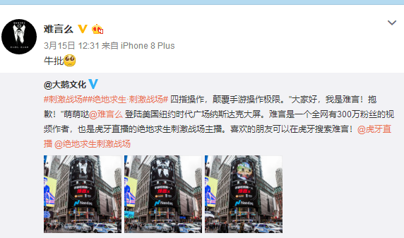 這波空降紐約時代廣場的天秀,難言自己本人也是很吃驚的,看到難言的動態(tài),也能感受到,除了感謝公會、感謝直播時代之外,估計也是激動的不知道說什么了吧。話說,這是第一個空降時代廣場的游戲主播嗎?