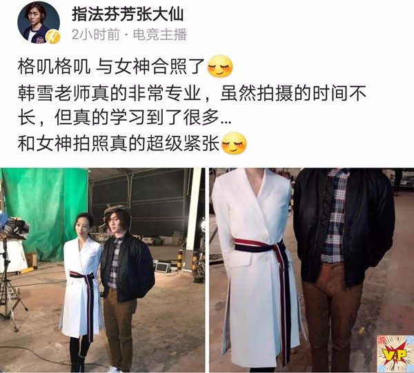 今天張大仙看起來(lái)心情美美噠,因?yàn)樗耥n雪合照了。他發(fā)表了狀態(tài),稱(chēng)韓雪老師真的非常專(zhuān)業(yè),雖然拍攝的時(shí)間不長(zhǎng),但是真的學(xué)習(xí)到了很多,還有和女神拍照真的超級(jí)緊張。話說(shuō)關(guān)注張大仙這么長(zhǎng)時(shí)間以來(lái),第一次看到他如此的一本正經(jīng),以前都是很隨意很浪的呀。相信大家也都跟使者有一樣的體會(huì)吧,看看張大仙制作的視頻,竟然還把自己打扮的那么搞笑,這下畫(huà)風(fēng)突變真的受不了啊。