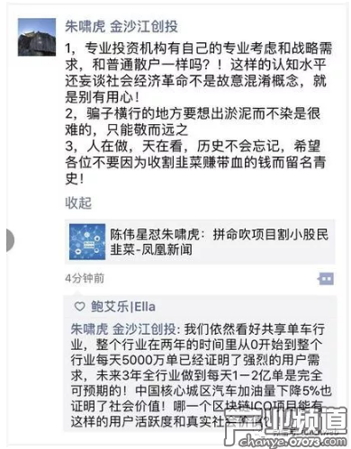 上一次沒太多人理會,不過,這一次陳偉星在社群中懟朱嘯虎,稱朱嘯虎拼命吹項目,然后讓別的vc接盤,通過名人效應割普通vc和小股民的韭菜。