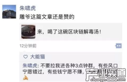 針對區(qū)塊鏈話題大熱的現(xiàn)象,朱嘯虎在朋友圈發(fā)表言論稱,“不要拉我進任何3點鐘群,有些風口寧愿錯過,有些錢寧愿不賺,大家晚節(jié)保重。”