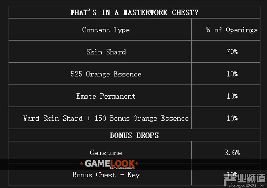 自8.7版本之后,玩家們可以從商店購(gòu)買大師寶箱Masterwork Chests,價(jià)格為165RP(箱子+鑰匙價(jià)格225RP),也可以用2250RP購(gòu)買11個(gè)寶箱和鑰匙禮包。從拳頭公布的掉率來(lái)看,大師寶箱相對(duì)于??怂箍萍枷渥痈咭恍?。