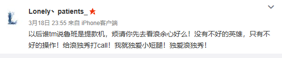 “以后誰tm說魯班是提款機(jī),煩請你先去看浪余心好么!沒有不好的英雄,只有不好的操作!給浪獨秀打call!我就獨愛小短腿!獨愛浪獨秀!”