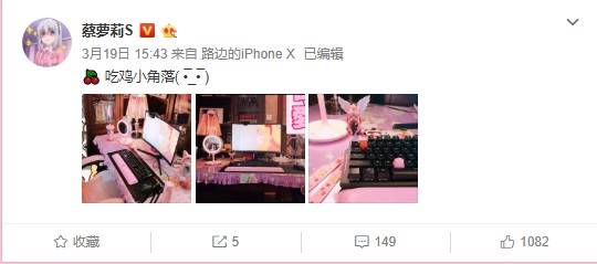當(dāng)然,一個(gè)良好的環(huán)境也會(huì)對(duì)吃雞的成功與否有著巨大的影響,關(guān)注了蔡蘿莉微博的網(wǎng)友一定會(huì)發(fā)現(xiàn),為了營(yíng)造一種吃雞氛圍,蔡蘿莉還特意在家中布置了一套設(shè)備,成功的打造了無(wú)敵美少女的粉嫩嫩吃雞戰(zhàn)場(chǎng),惹得好多網(wǎng)友,尤其是吃雞女玩家羨慕不已。