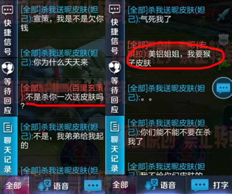 我們可以看到這個妹子的ID為“殺我送昵(你)皮膚”。相信很多人看到這個皮膚都想去擊殺她,如果是真的話,自己可以得到皮膚。也正因為如此,自己經(jīng)常在游戲當中被人給”群毆“ 。通過聊天記錄我們可以看到,對方的打野經(jīng)常去中路抓,甚至對方安琪拉都說出了自己想要的皮膚。