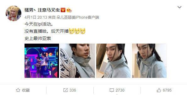 “今天在LPL活動,沒有直播哈,后天開播,史上最帥亞索!”騷男在微博上說道。