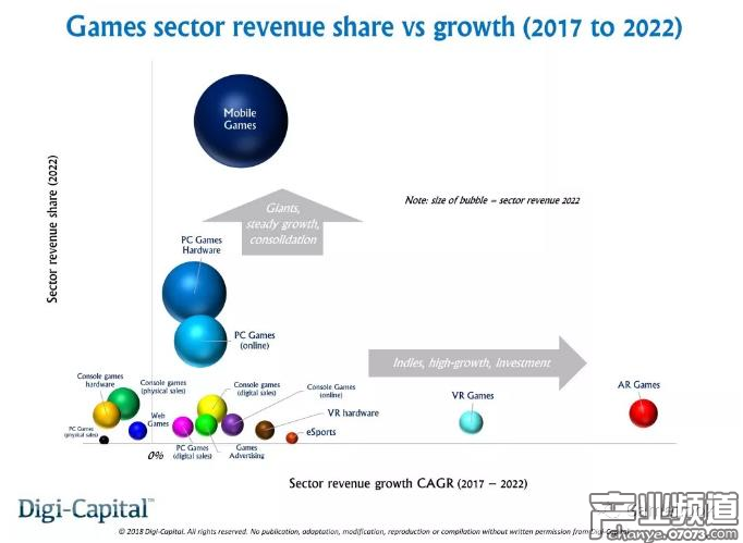 雖然已經(jīng)連續(xù)多年持續(xù)下滑,但按照目前的發(fā)展趨勢,主機游戲到2025年仍將占據(jù)游戲市場重要的地位,未來五年內(nèi)其余幾個可能出現(xiàn)數(shù)十億美元增減的領(lǐng)域包括,穩(wěn)定增長的(數(shù)字)主機游戲、高速增長的AR游戲(起點較低)、穩(wěn)定增長的(在線)主機游戲、穩(wěn)定增長的游戲廣告收入、低速增長的PC游戲(數(shù)字版收入)、穩(wěn)定增長的VR硬件(起點較低)、持續(xù)降低的網(wǎng)頁游戲市場、強勢增長(但規(guī)模不大)的電競以及持續(xù)縮水的PC(實體)游戲收入。