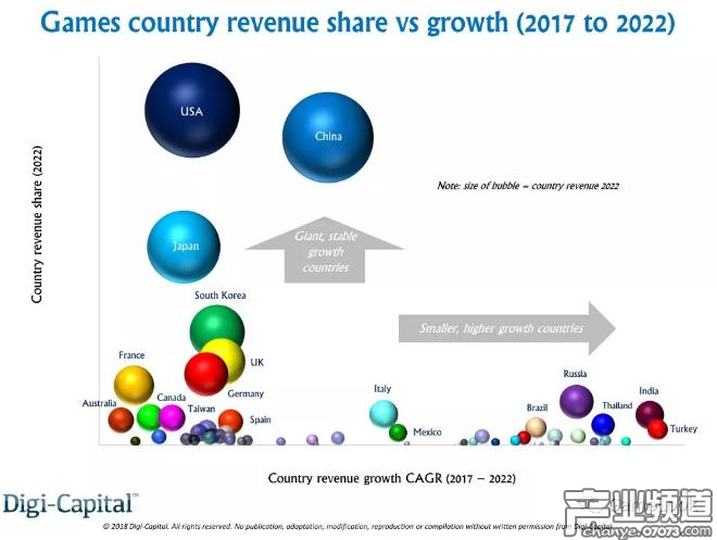 中美日韓四國加起來可以占據(jù)五年后全球游戲市場收入的三分之二,但從Digi-Capital統(tǒng)計的50款游戲數(shù)據(jù)來看,亞洲地區(qū)的市場份額仍將大于北美和歐洲之和。不同地區(qū)的游戲市場收入增長趨勢也不相同,從區(qū)域來看,亞洲的收入規(guī)模和增長速度是帶動全球游戲業(yè)收入增長的主要動力。該有些高速增長的市場目前并沒有進入前十,比如東歐、拉丁美洲和中東非國家雖然市場規(guī)模很小,但增長幅度卻很高。
